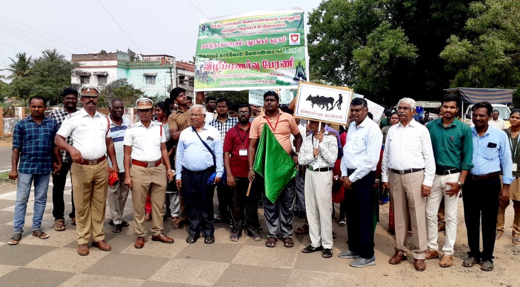 சிவகங்கை மாவட்டம் காரைக்குடி அருகே உள்ள கல்லுப்பட்டி சேதுபாஸ்கரா வேளாண்மை கல்லூரி மற்றும் ஆராய்ச்சி மையத்தில் நடந்து வரும் பார்வைத் திறன் குறைபாடுள்ளவர்களுக்கான முதலாம் ஆண்டு தேசிய அளவிலான ஃபிடே செஸ் போட்டியை ஊக்கப்படுத்தும் வகையில் காரைக்குடி பெரியார் சிலை அருகில் மவிழிப்புணர்வு பேரணி நடைபெற்றது.
