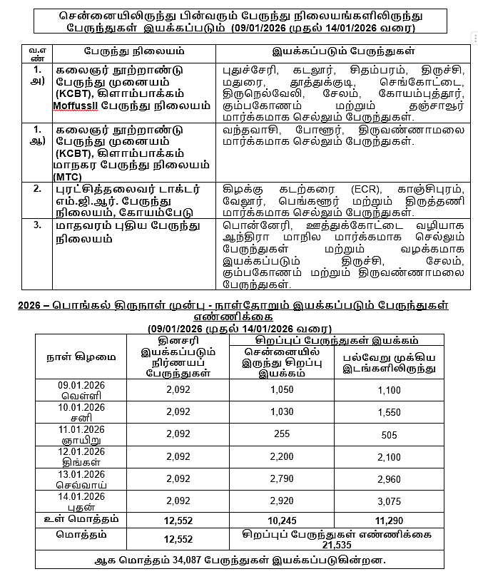 பொங்கல் திருநாள் முடிந்த பின்னர், பிற ஊர்களிலிருந்து சென்னைக்கு, வரும் பயணிளுக்காக 16/01/2026 முதல் 19/01/2026 வரையில், தினசரி இயக்கக் கூடிய 2,092 பேருந்துகளுடன் 6,820 சிறப்புப் பேருந்துகள் என மொத்தமாக 15,188 பேருந்துகளும், ஏனைய பிற முக்கிய ஊர்களிலிருந்து பல்வேறு ஊர்களுக்கு 9,820 என ஆக மொத்தம் 25,008 பேருந்துகளும் இயக்கப்படுகின்றன.