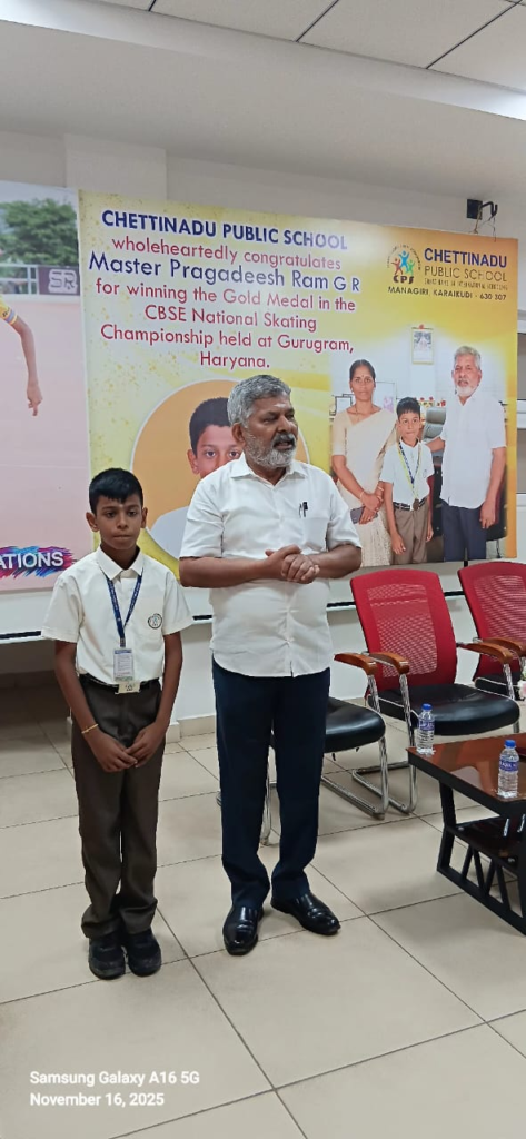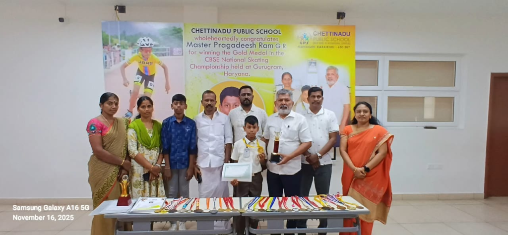செட்டிநாடு பப்ளிக் பள்ளியின் ஆறாம் வகுப்பு மாணவர் மாஸ்டர் பிரகதீஸ்வராம், கோயமுத்துார் அவனி பப்ளிக் பள்ளியில் ஆகஸ்ட்-26 முதல் 30 வரை நடைபெற்ற 11 வயதிற்குட்பட்டோருக்கான வடக்கு மண்டல(North Zone) ஸ்கேட்டிங் சாம்பியன்ஷிப் போட்டியில் பங்கேற்று (300 mtrs In-line) தங்கப் பதக்கத்தை வென்றார்.